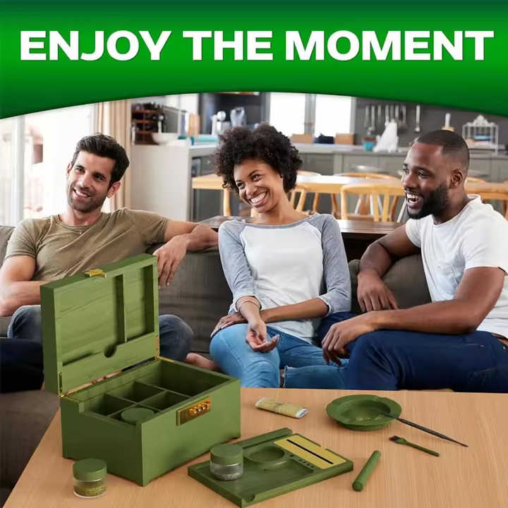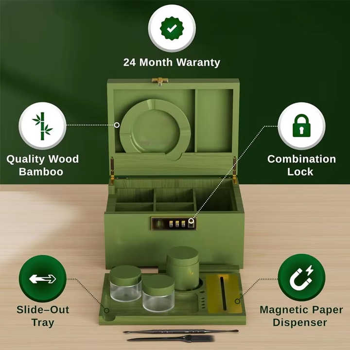 Complete Kit with Premium Tools – Includes 2 storage jars, built-in rolling tray, high-quality grinder, cleaning brush and ashtray. Perfect for keeping everything organized and tidy, the set is designed for a seamless and elevated experience. Ideal for beginners or seasoned users.